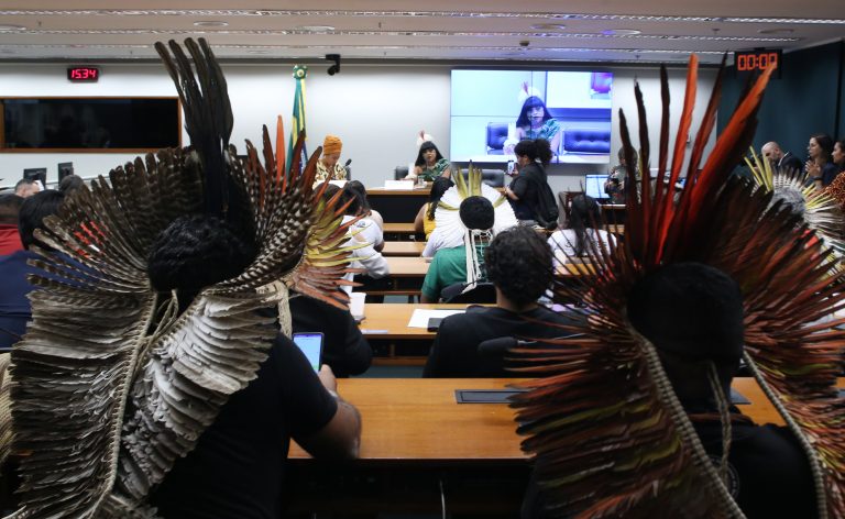 Em debate promovido na Câmara, eles criticaram a aprovação da Lei do Marco Temporal Foto: Elio Rizzo / Cãmara dos Deputados Lideranças indígenas participantes de um seminário promovido pela Comissão da Amazônia e dos Povos Originários e Tradicionais da Câmara dos...