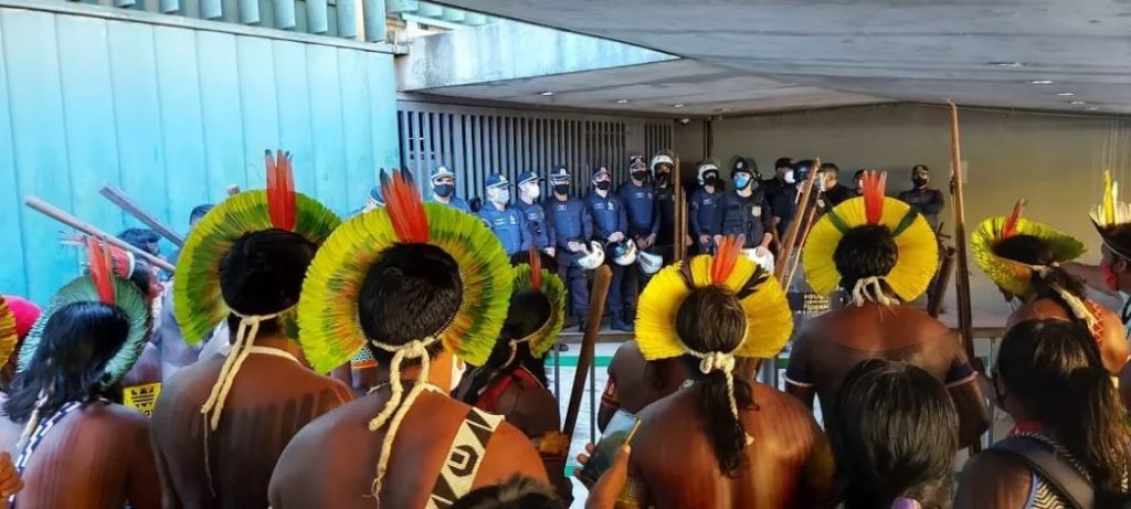 O Projeto de Lei 490/2007 está desde o dia 8 de junho na pauta da CCJ que é presidida pela deputada bolsonarista Bia Kicis (PSL/SP). Desde então, nos dias que tiveram sessão, os indígenas se manifestaram com rituais de canto e dança no estacionamento do Anexo 2 da Casa legislativa, local mais próximo do plenário onde ocorrem as reuniões. A Agência Pública acompanhou cinco dias da mobilização e não presenciou nenhuma violência e nem tentativas de invasão por parte dos indígenas, ao contrário do que afirmou o presidente da Câmara, deputado federal Arthur Lira (PP/AL).