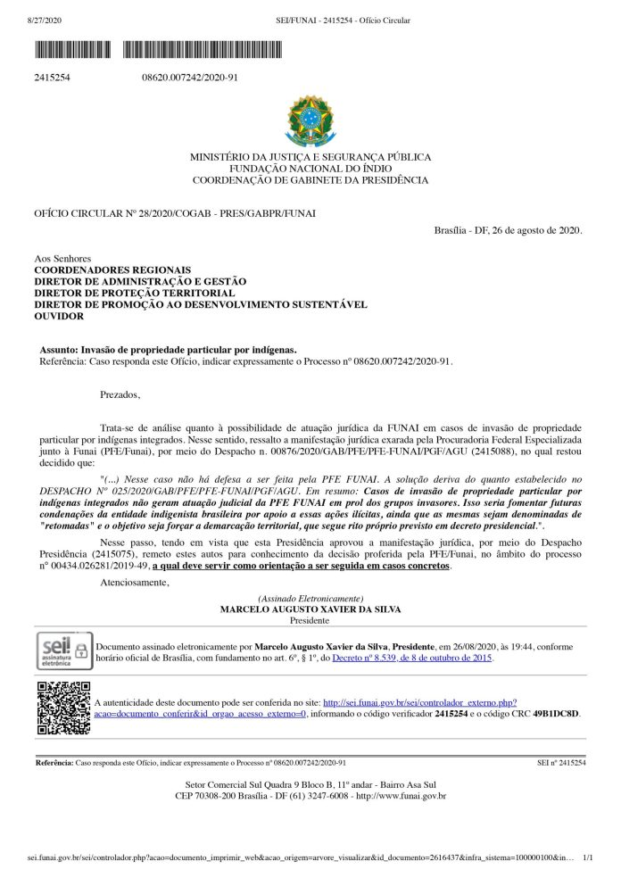 Esse ofício circular – 28/08 de 2020 – do presidente da Funai, Marcelo Augusto Xavier Silva, retoma a ideia da tutela do Estatuto do Índio de 1973, Lei 6001, mas agora ao reverso, ou seja, não para protege-los, mas para inibi-los, controla-los, amedrontando-os a não agirem em sua defesa, pelos seus direitos e pela suas terras. Portanto, para proteger grileiros e fazendeiros invasores, o atual presidente da Funai propõe a tutela ao reverso.