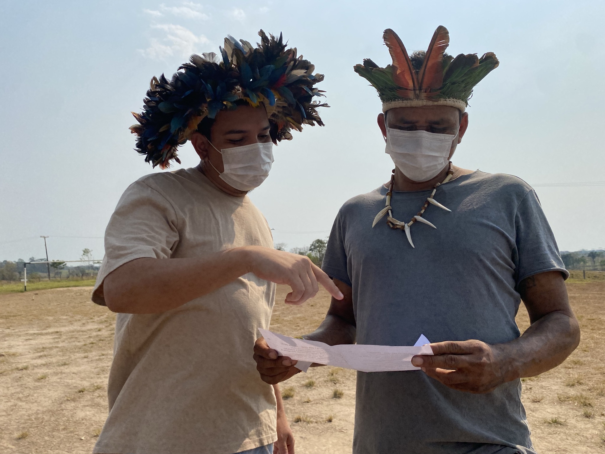 Gilcélio Huni Kuĩ (esq.) e Elson Huni Kuĩ, monitores da TI Kaxinawá do Rio Humaitá em curso de monitoramento comunitário realizando em novembro de 2021 no CFPF. (foto: Leilane Marinho)