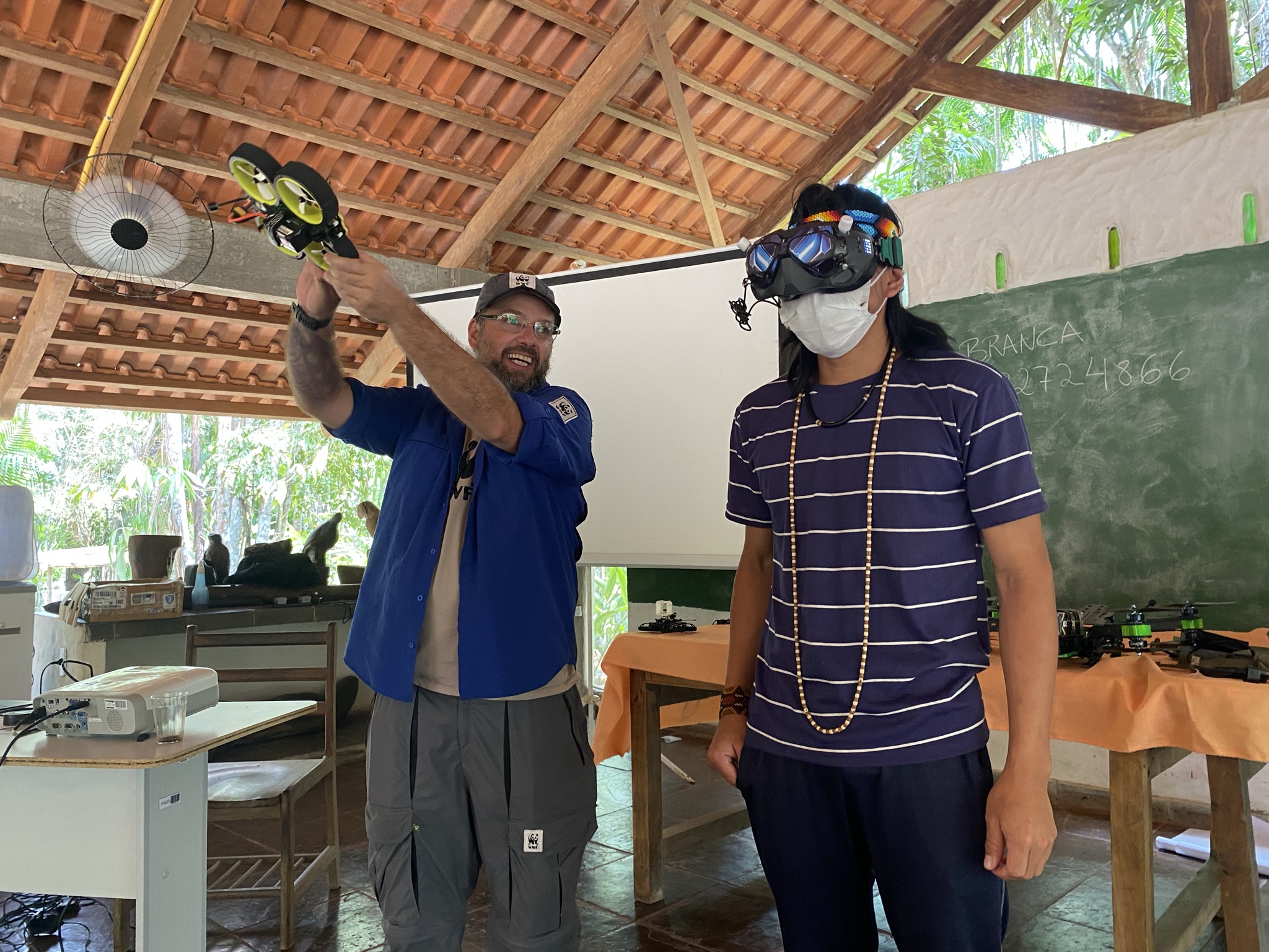 “A ideia desse trabalho com tecnologias é justamente somar com as ferramentas que eles já usam nas ações de monitoramento, pensando em aumentar a capacidade de vigilância do território com segurança, pois sabemos que os indígenas estão muito expostos a perigos”, conta Felipe Spina, do WWF-Brasil, que em parceria com o Batalhão de Policiamento Ambiental da Polícia Militar do Acre (BPMA-AC) e com a participação do instrutor indígena Alnir Oyexiener Paiter Suruí, do Instituto Kanindé em Rondônia, ministrou um treinamento sobre o uso de drones no Curso de Uso de Tecnologias para o Monitoramento Comunitário e Proteção Territorial, realizado em agosto pela CPI-Acre no CFPF.