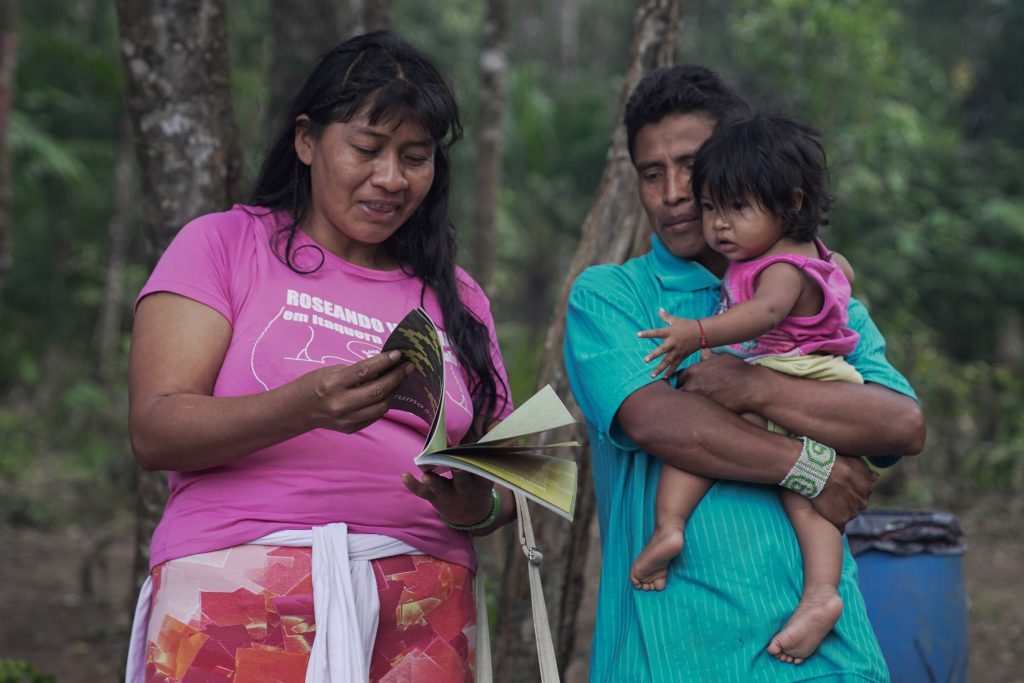 Guarani folheiam Plano de Visitação da Terra Indígena Tenondé Porã (SP) durante evento de lançamento na aldeia Yrexakã (foto: Luiza Calagian)