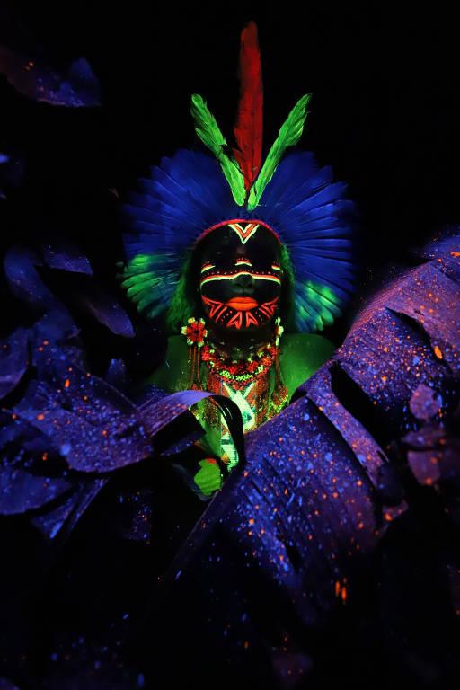 Era noite na floresta quando um grupo de indígenas de vários povos se reuniu em meio às folhagens exuberantes de Inhotim. Munidos de uma tinta que brilha no escuro, eles pintaram seus corpos com grafismos típicos de suas etnias.