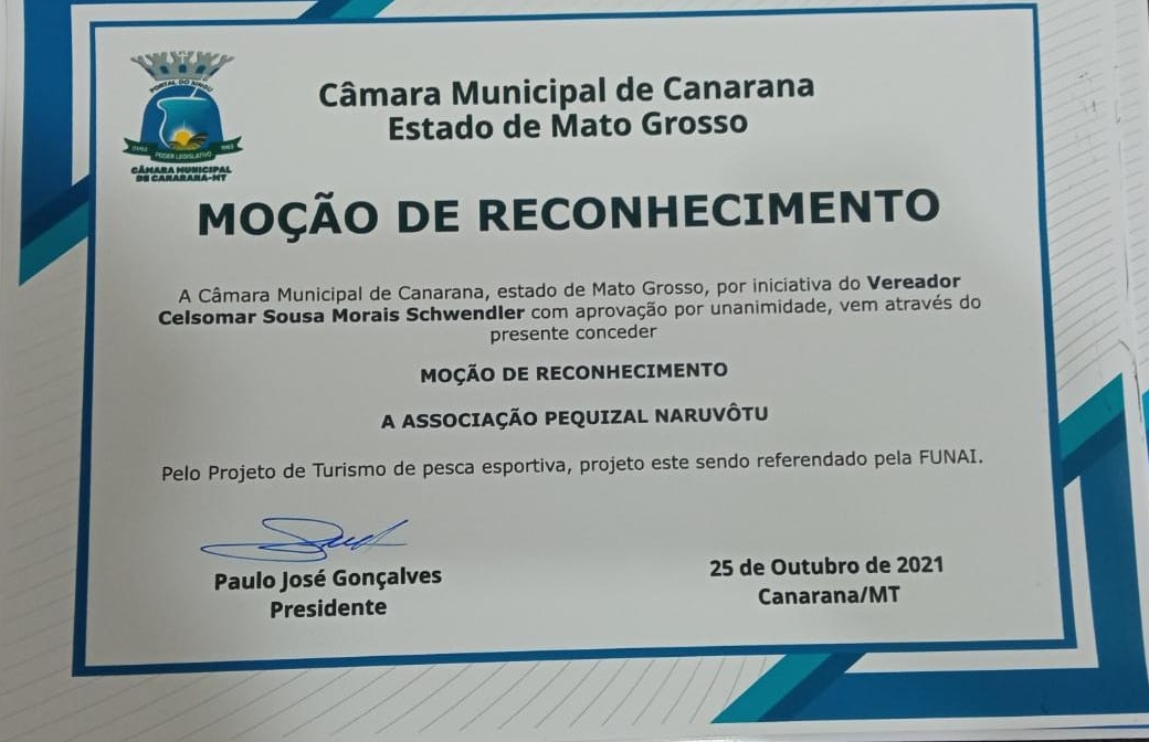 A Câmara Municipal de Canarana, no estado de Mato Grosso, concedeu uma Moção de Reconhecimento à Associação Pequizal Naruvôto pelo Projeto de Turismo de Pesca Esportiva. A iniciativa, realizada na Terra Indígena (TI) de mesmo nome, localizada nas cidades de Canarana e Gaúcha do Norte, é desenvolvida em parceria entre os indígenas e o setor privado, com apoio da Fundação Nacional do Índio (Funai).