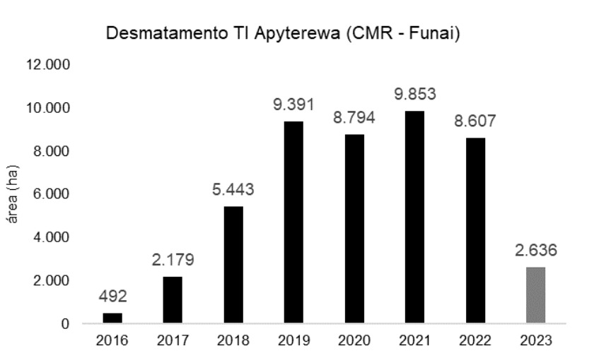 Na série histórica, iniciada em 2016 (ver gráfico), é possível observar que foram registrados 492 hectares de área desmatada. Naquela ocasião estavam em curso ações de desintrusão, que não chegaram a ser concluídas. Com a paralisação dos trabalhos, o desmatamento aumentou nos anos subsequentes e alcançou patamares muito elevados entre os anos de 2019 e 2022, recuando somente em 2023, quando as ações de retirada de invasores foram retomadas.Gráfico CMR/Funai