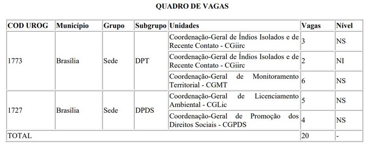 As vagas ofertadas são destinadas à Coordenação-Geral de Índios Isolados e de Recente Contato (CGiirc) e Coordenação-Geral de Monitoramento Territorial (CGMT), ambas da Diretoria de Proteção Territorial (DPT); e Coordenação-Geral de Licenciamento Ambiental (CGLic) e Coordenação-Geral de Promoção dos Direitos Sociais (CGPDS), ambas da Diretoria de Promoção ao Desenvolvimento Sustentável (DPDS). Confira abaixo o quadro de vagas.