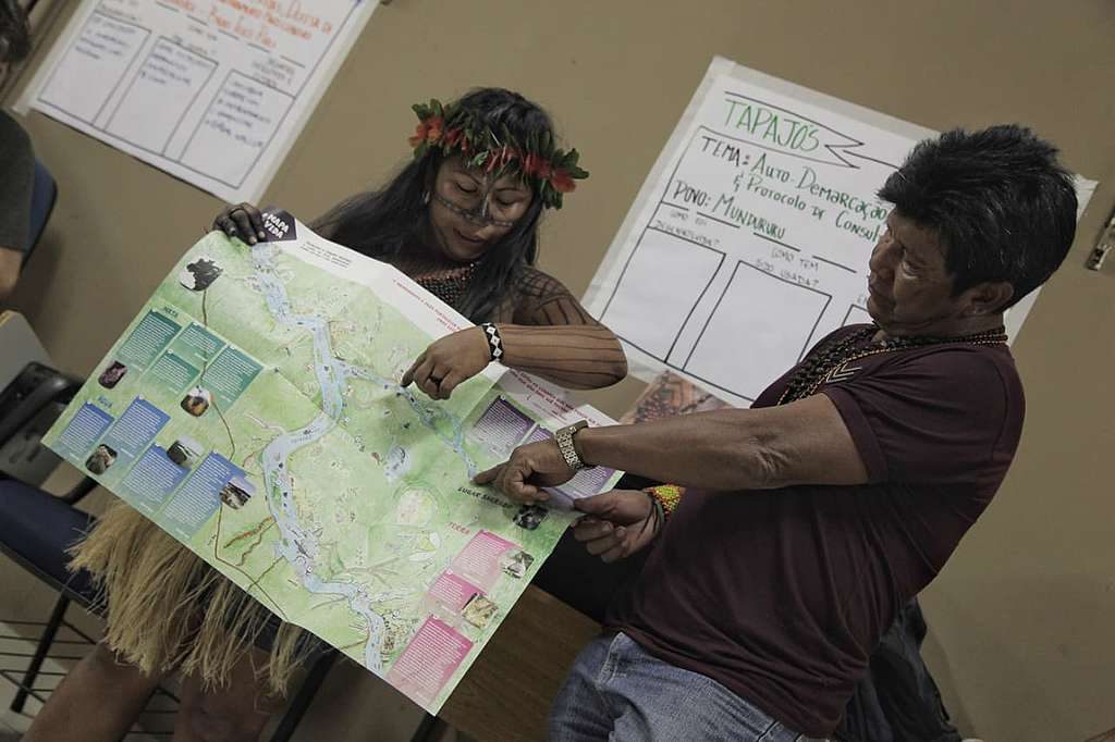 Lideranças Munduruku apresentam o Mapa da Vida durante o evento Belém+30. © Coletivo Proteja Amazônia