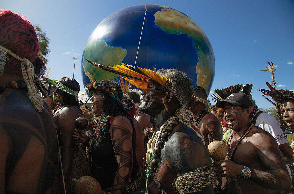 Lideranças indígenas reunidas no Acampamento Terra Livre, em Brasília, em defesa dos territórios e do planeta