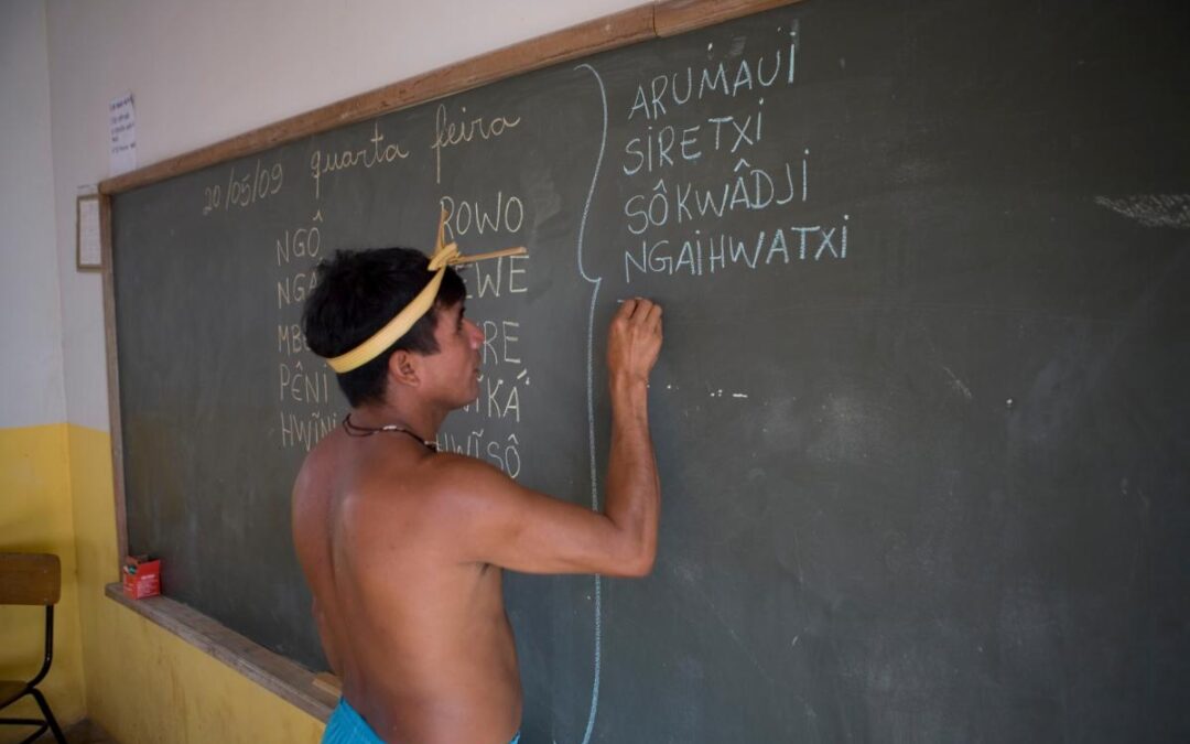 Aula na aldeia Ngojwêrê, do povo Khisêtjê, na Terra Indígena Wawi, no Mato Grosso, valoriza língua indígena 📷 Ton Koene