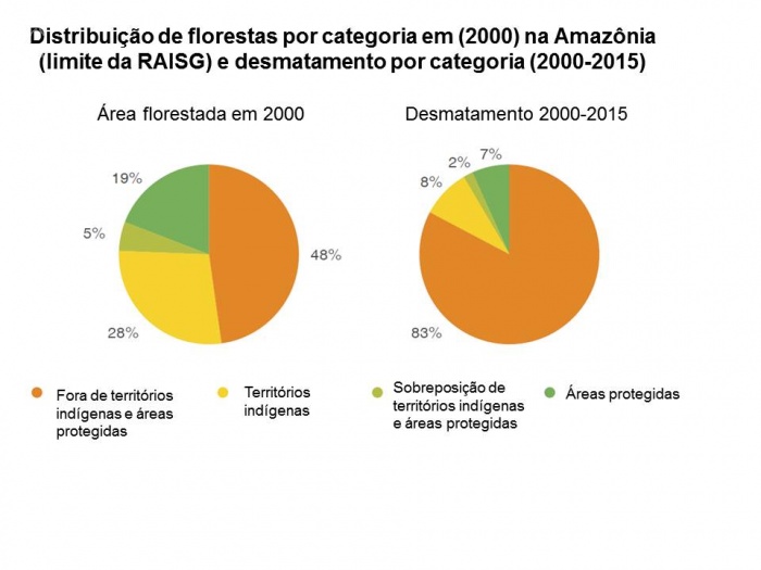 O estudo do consórcio, formado pela Rede Amazônica de Informação Socioambiental Georreferenciada (Raisg), Coica (Coordenação das Organizações Indígenas da Bacia Amazônica), EDF (Environmental Defense Fund) e Woods Hole (WHRC) dá conta de que 83% do desmatamento na Amazônia, entre 2001 e 2015, ocorreu fora dos territórios indígenas e áreas protegidas. O que chama a atenção é que somente 48% da área de florestas na Amazônia se encontra fora desses territórios e áreas protegidas. No período considerado, a tendência na região foi a redução do desmatamento nas unidades analisadas, com exceção do desmate que se refere a territórios Indígenas não reconhecidos oficialmente, onde houve um aumento de 50%. (veja o gráfico)